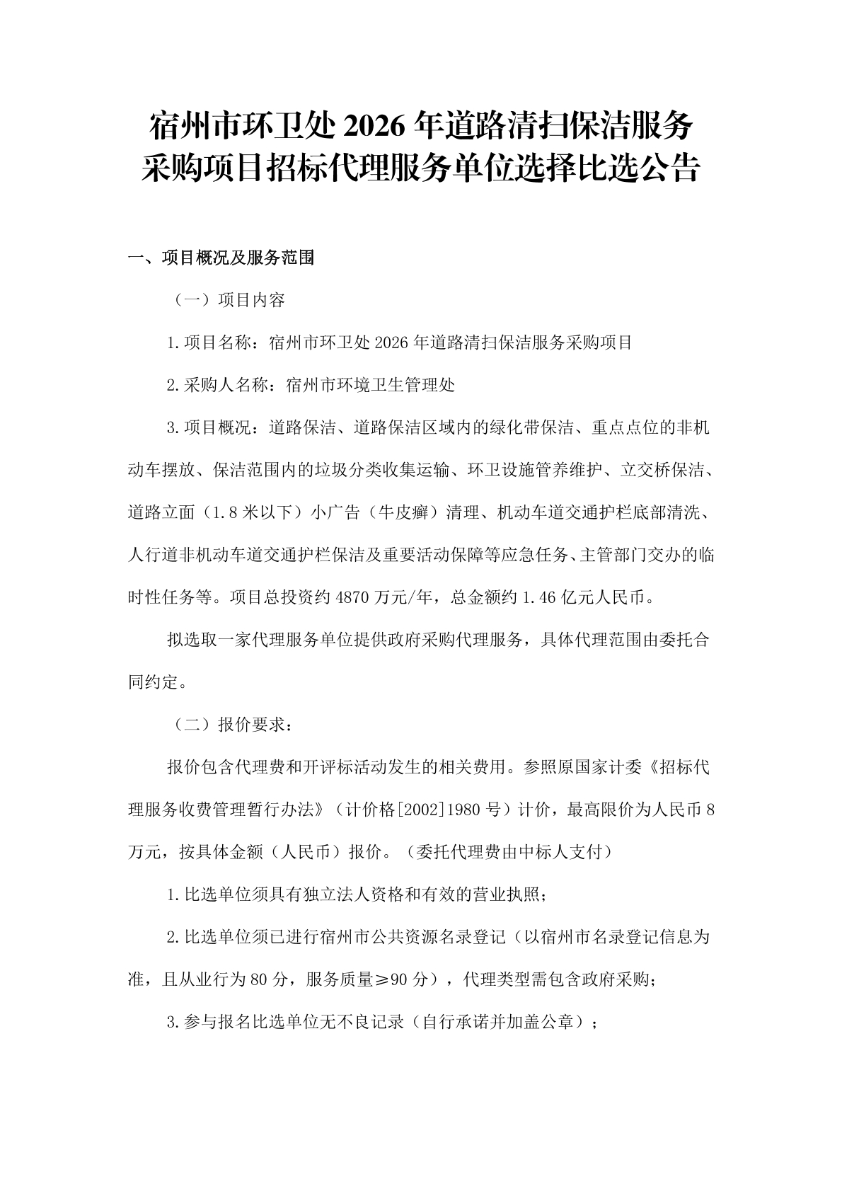 宿州市环卫处2026年道路清扫保洁服务采购项目招标代理服务单位选择比选公告